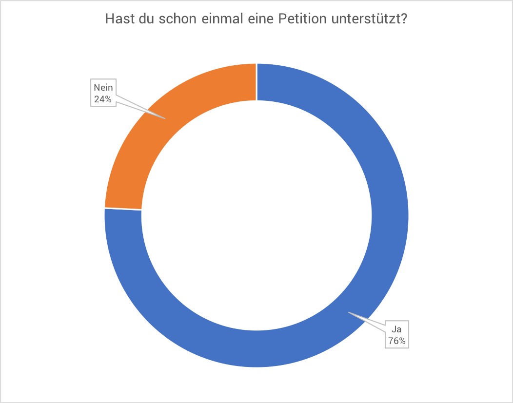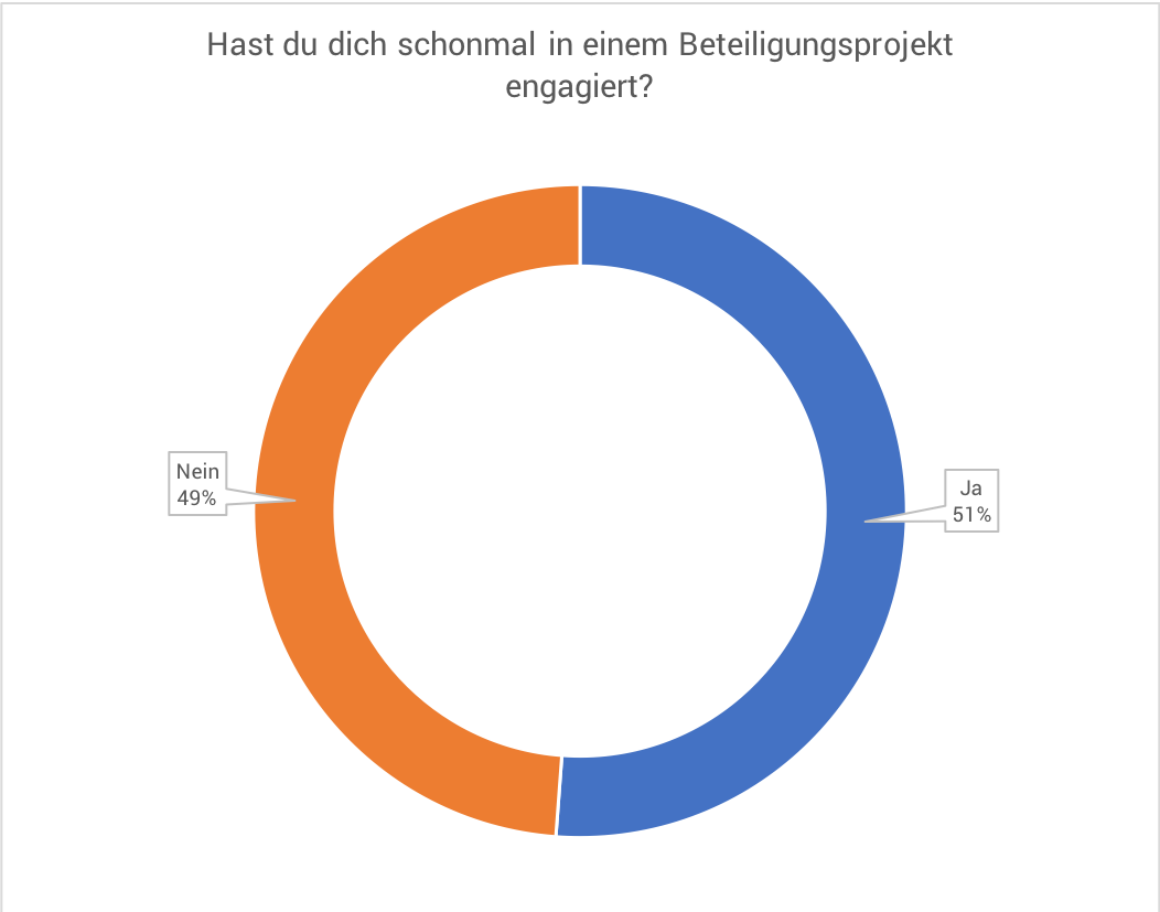 So gaben 62% an, schon einmal an einer Demonstration teilgenommen zu haben und mehr als drei Viertel der Befragten haben schon einmal eine Petition unterstützt. Und sogar die Hälfte der Teilnehmer-innen hat sich bereits zuvor in einem Beteiligungsprojekt engagiert.