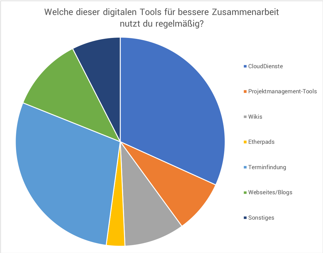 Eine weitere spannende Frage für die Ausgestaltung der we decide Plattform ist es, welche digitalen Tools für eine bessere Zusammenarbeit die Teilnehmer-innen regelmäßig nutzen. Dabei sind Clouddienste (ca. 65%) sowie Terminfindungstools (ca. 60%) deutlich am beliebtesten und sollten demnach auch in die Online-Beteiligungsplattform miteinbezogen werden. Weniger häufig werden Projektmanagement-Tools, Wikis, Webseiten/Blogs oder Etherpads genutzt.