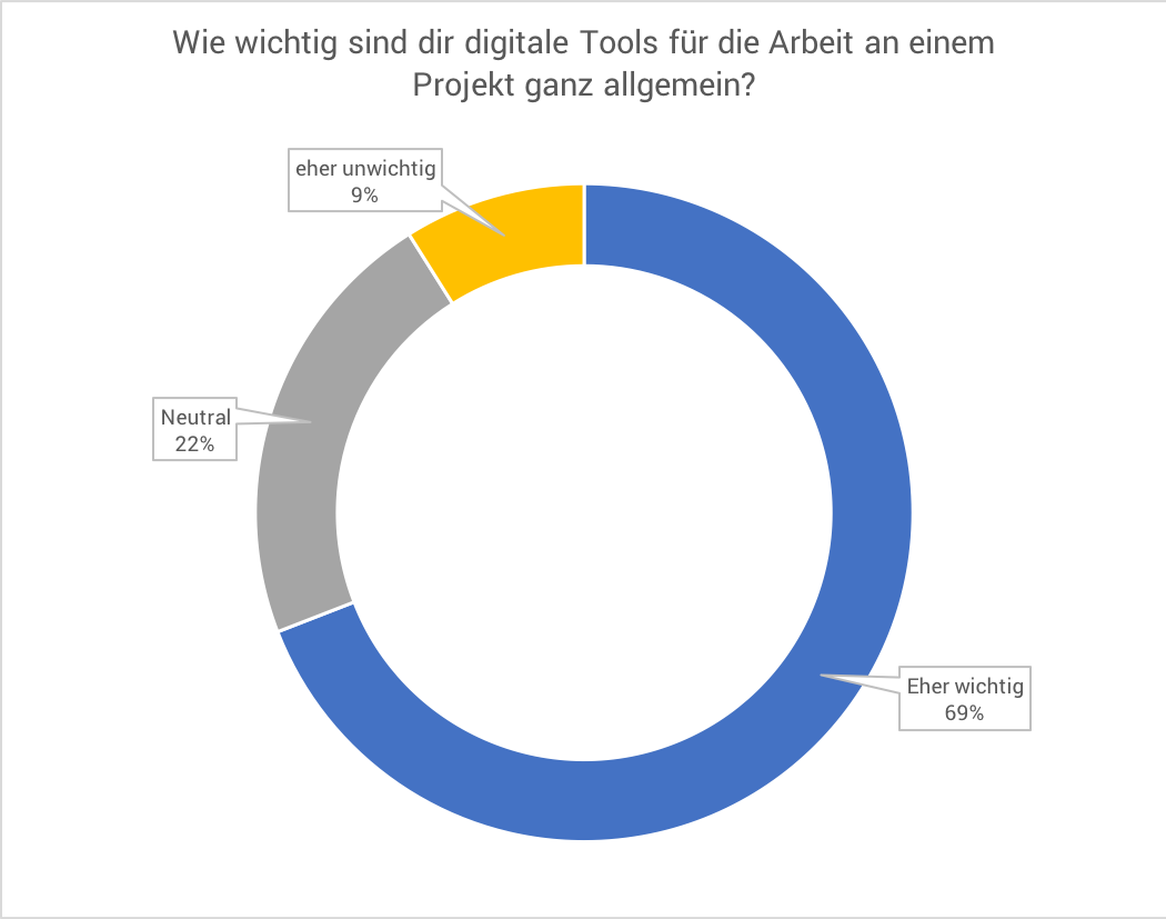 Bevor wir detailliert nach bestimmten digitalen Tools fragten, wollten wir erst einmal wissen, wie wichtig den Mitwirkenden diese ganz allgemein für die Arbeit an einem Projekt sind. Ungefähr 7 von 10 Befragten antworteten dabei mit „wichtig“ oder „sehr wichtig“.