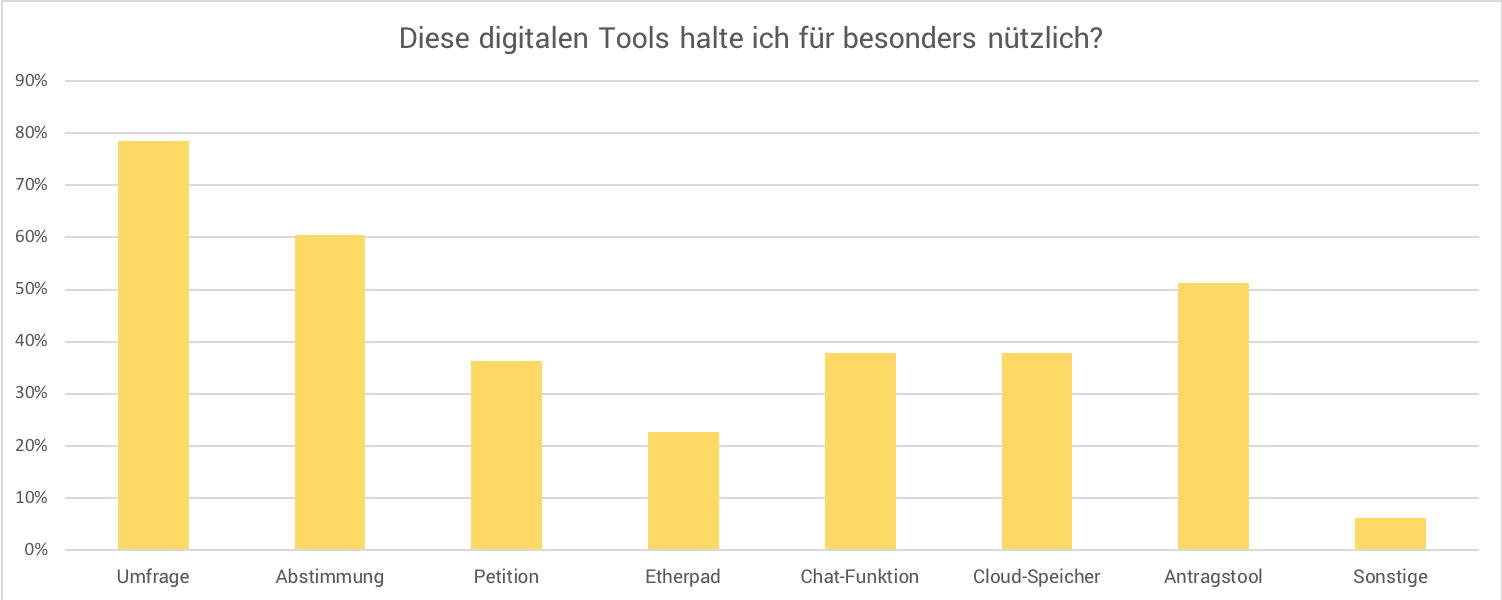 Darüber hinaus wollten wir noch wissen, welche digitalen Tools sie – unabhängig von der eigenen Nutzung – für besonders nützlich halten. Deutlich am häufigsten wurden dabei Umfragen (knapp 80%) und Abstimmungen (60%) genannt. Ein Antragstool zum gemeinsamen Arbeiten an Anträgen fandn etwa die Hälfte der Befragten nützlich. Petition, Chat-Funktion, Cloud-Speicher, Etherpad hielten nur deutlich weniger als 40% der Befragten für besonders effektiv.