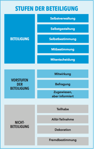 Mit der genauen Definition von Beteiligung haben sich Politikwissenschaftler-innen und Praktiker-innen in der Jugendarbeit immer wieder umfassend beschäftigt. In den allermeisten Fallen wird dabei von Partizipation gesprochen. Partizipation setzt sich aus lateinischen Wörtern zusammen, nämlich aus »pars« (der Teil) und »capere« (nehmen) und bedeutet daher wörtlich Beteiligung im Sinne von Teilnahme. Folgende Stufen der Beteiligung kann man systematisch anordnen.